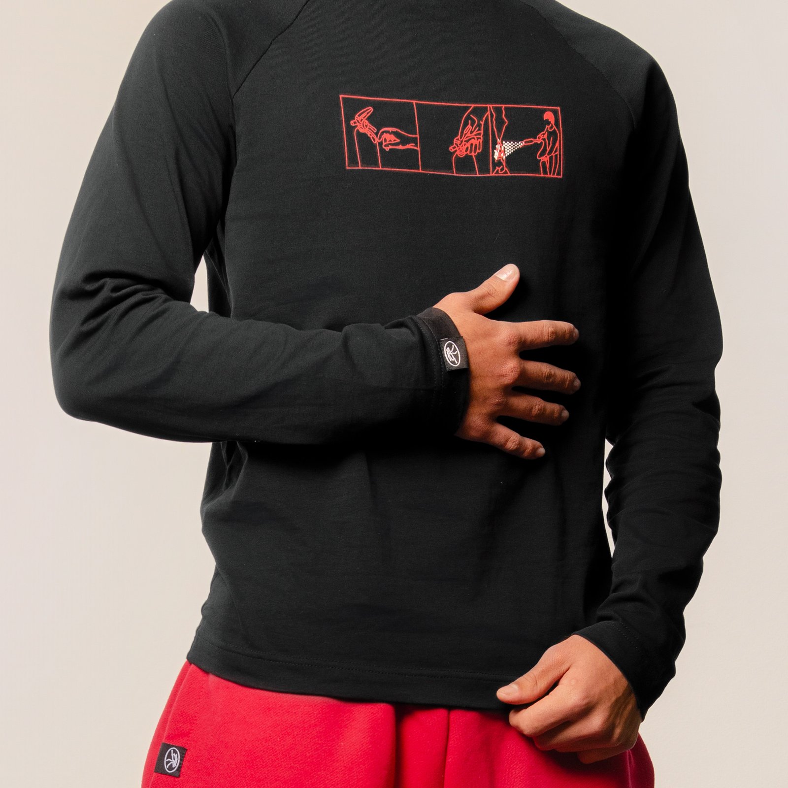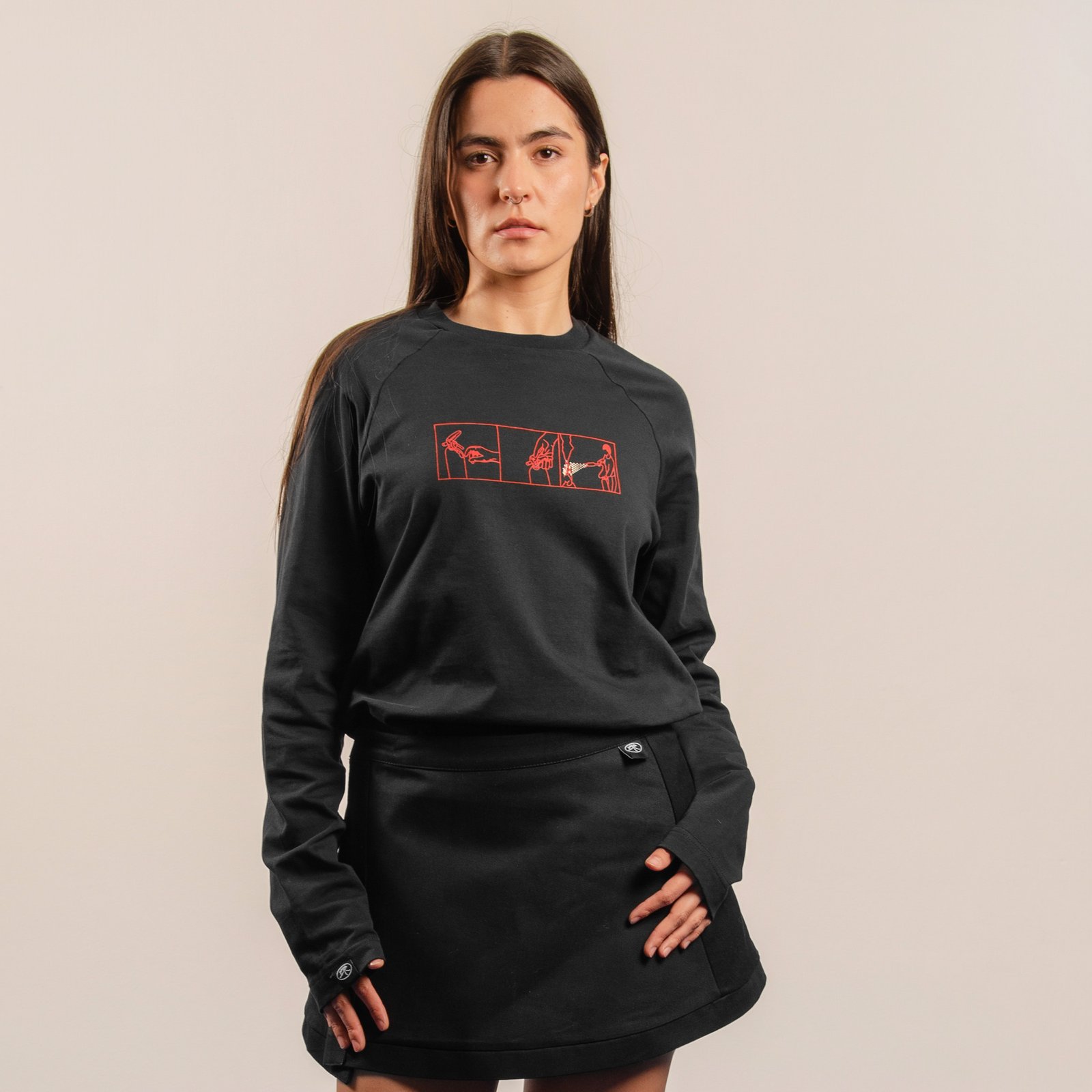 Camibuzo oversize en 100% algodón. Manga tipo Ranglan que inician en el cuello y caen hacia la axila. Serigrafía, en pecho, de ilustración “Cómo Apagar una Cabeza en Llamas”.