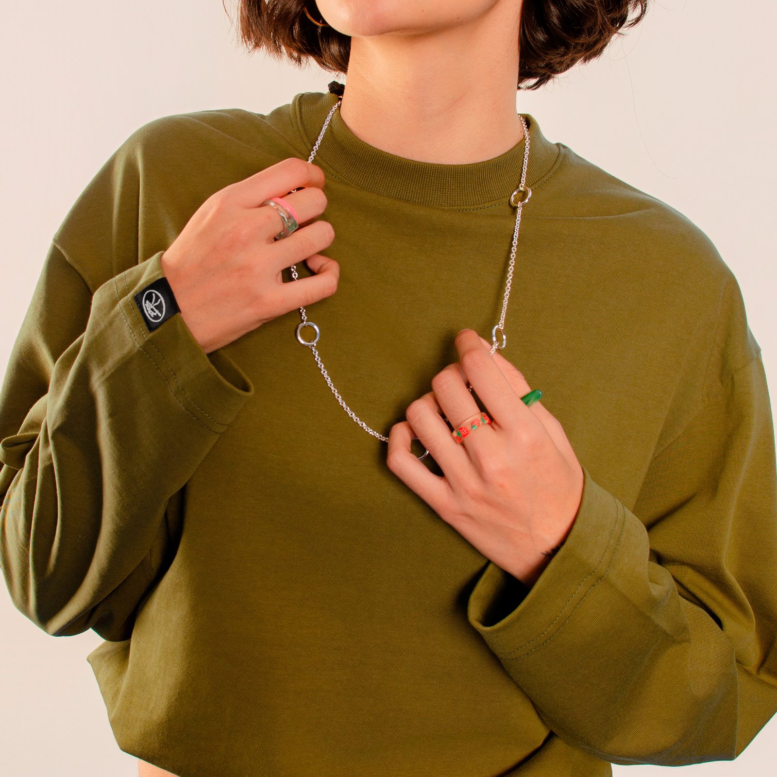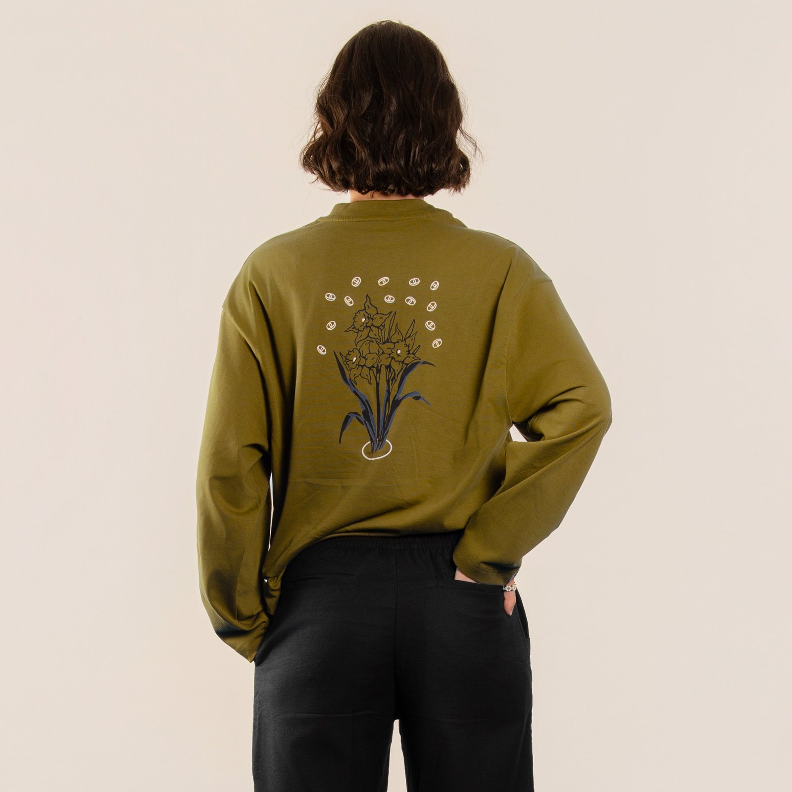 Camibuzo verde oversize en 100% algodón. Serigrafía, en espalda, de ilustración “Escitalopram, Narcisos”.