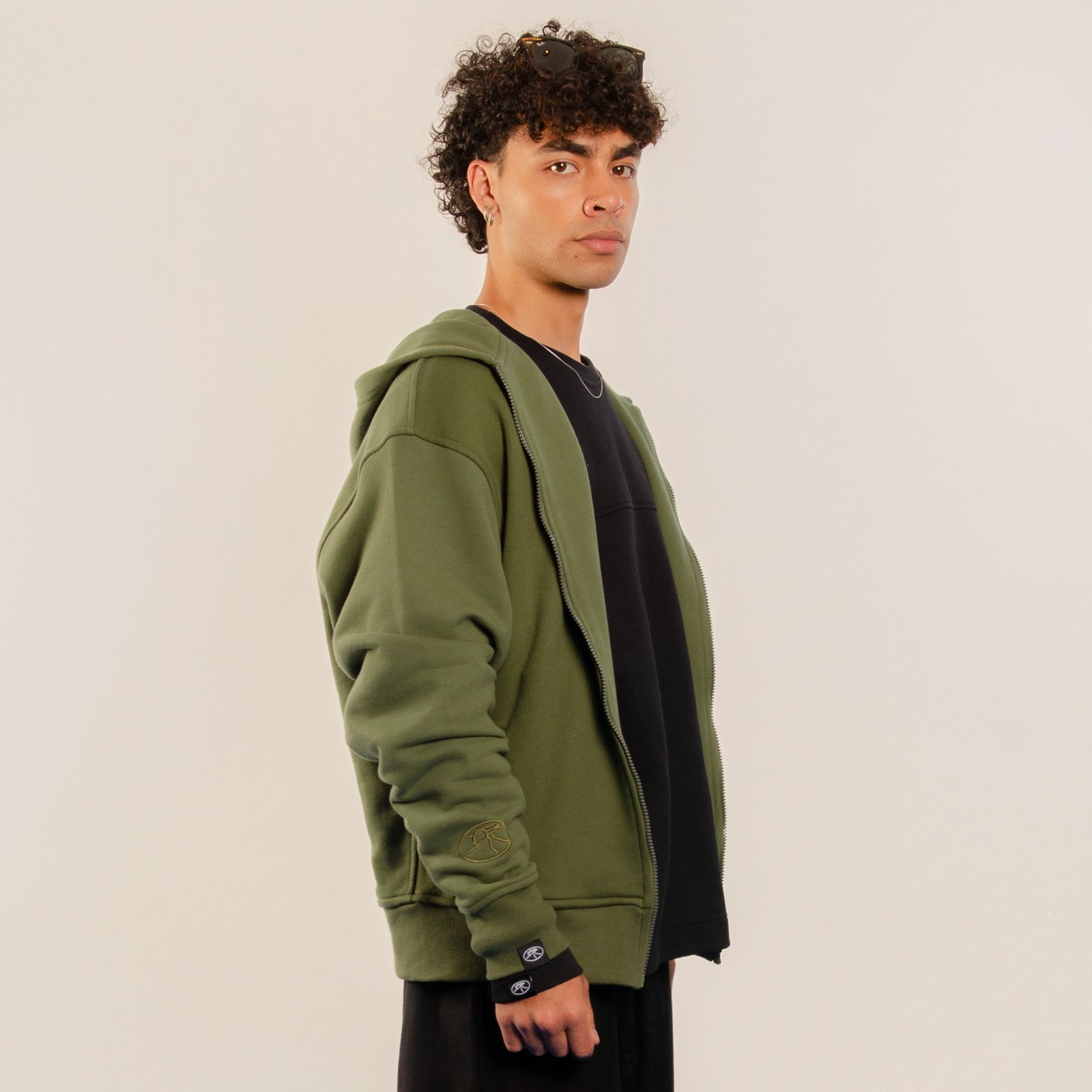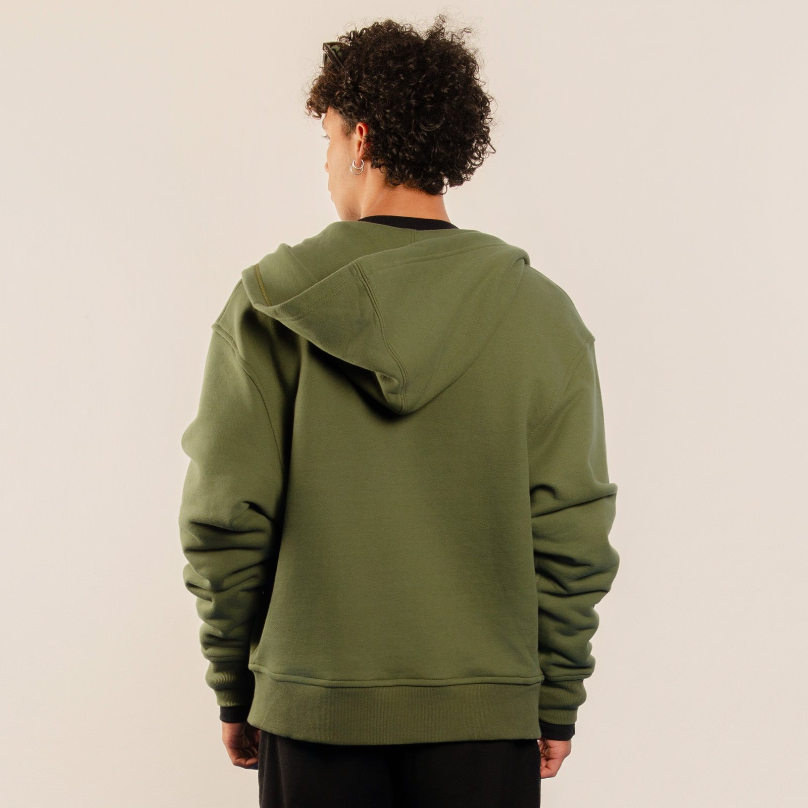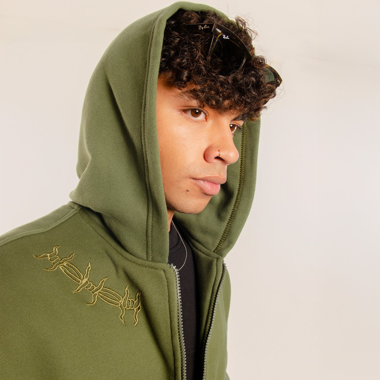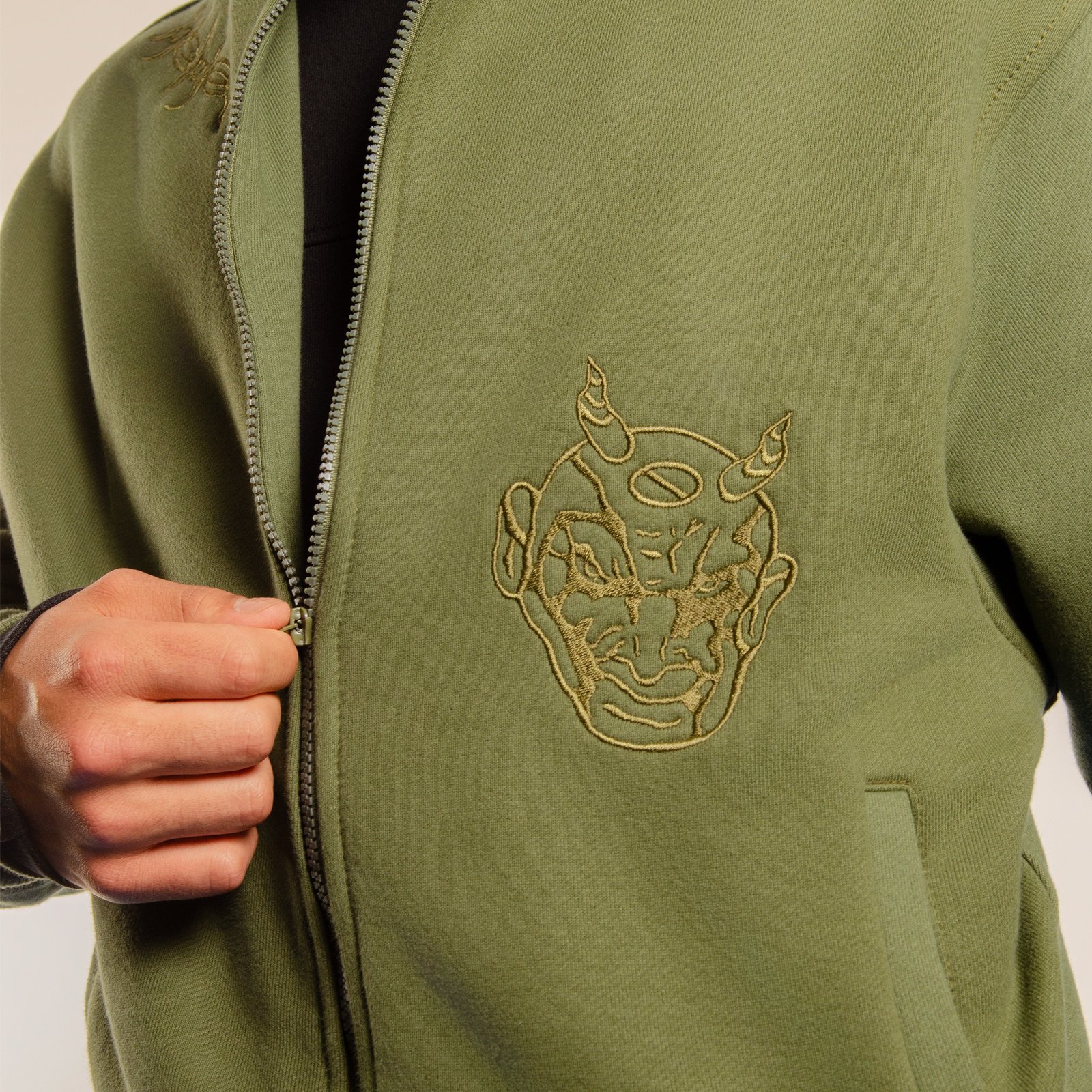 Hoodie abierto verde oversize con bolsillo oculto dividido. Bordado tono a tono de ilustración “Alambre de púas y demonio en pecho”.