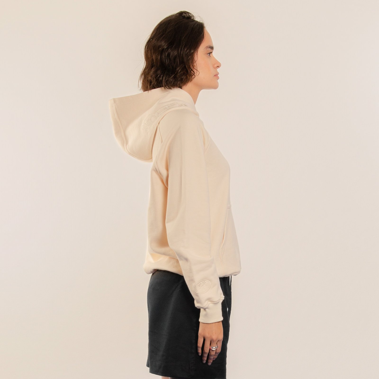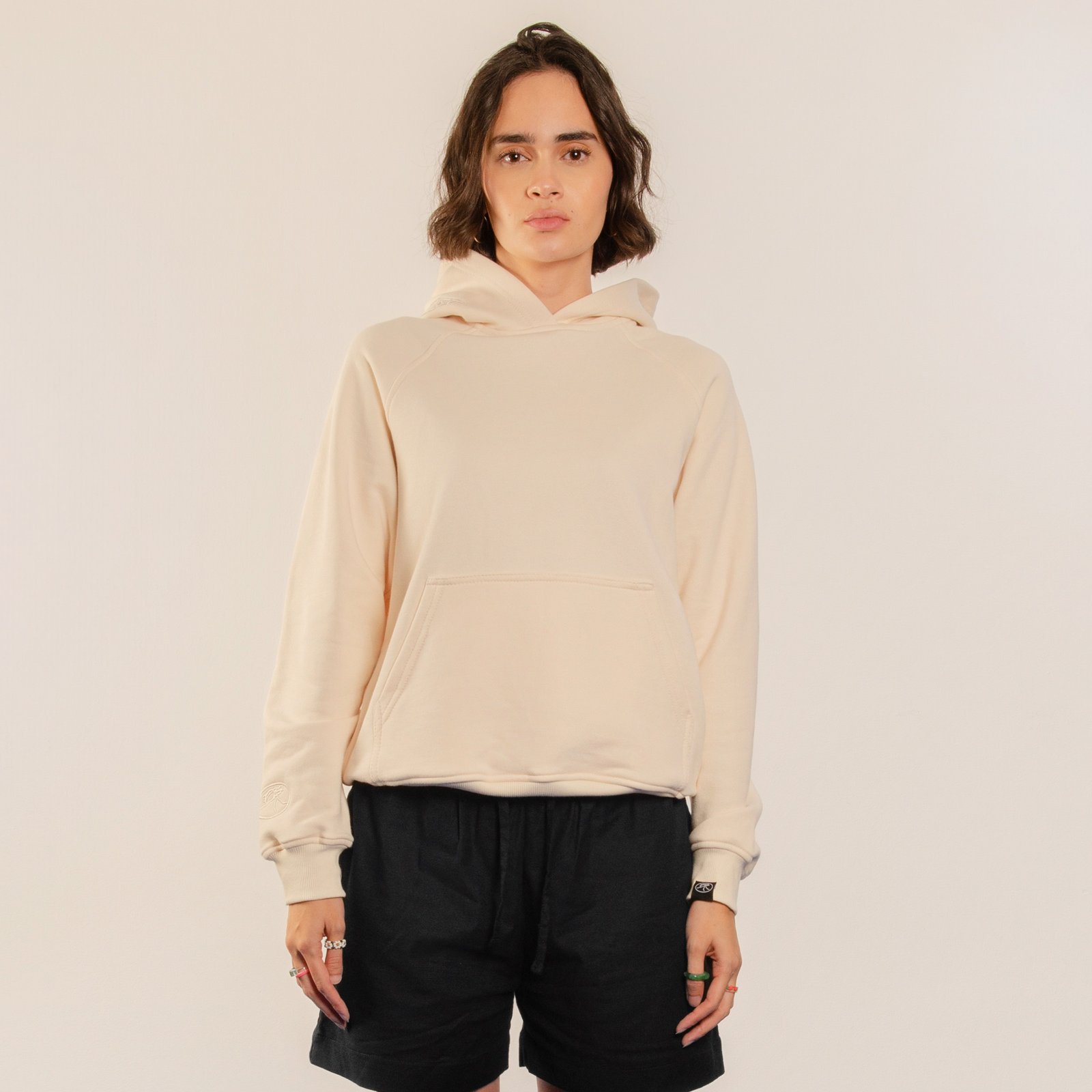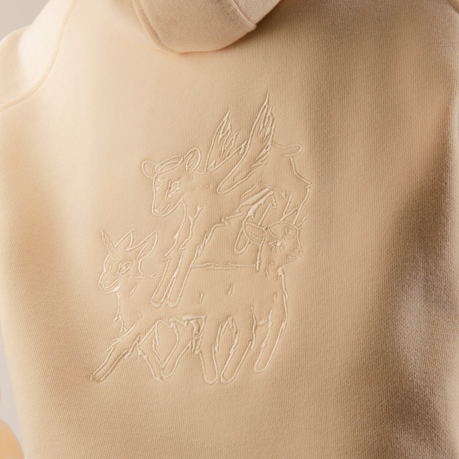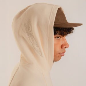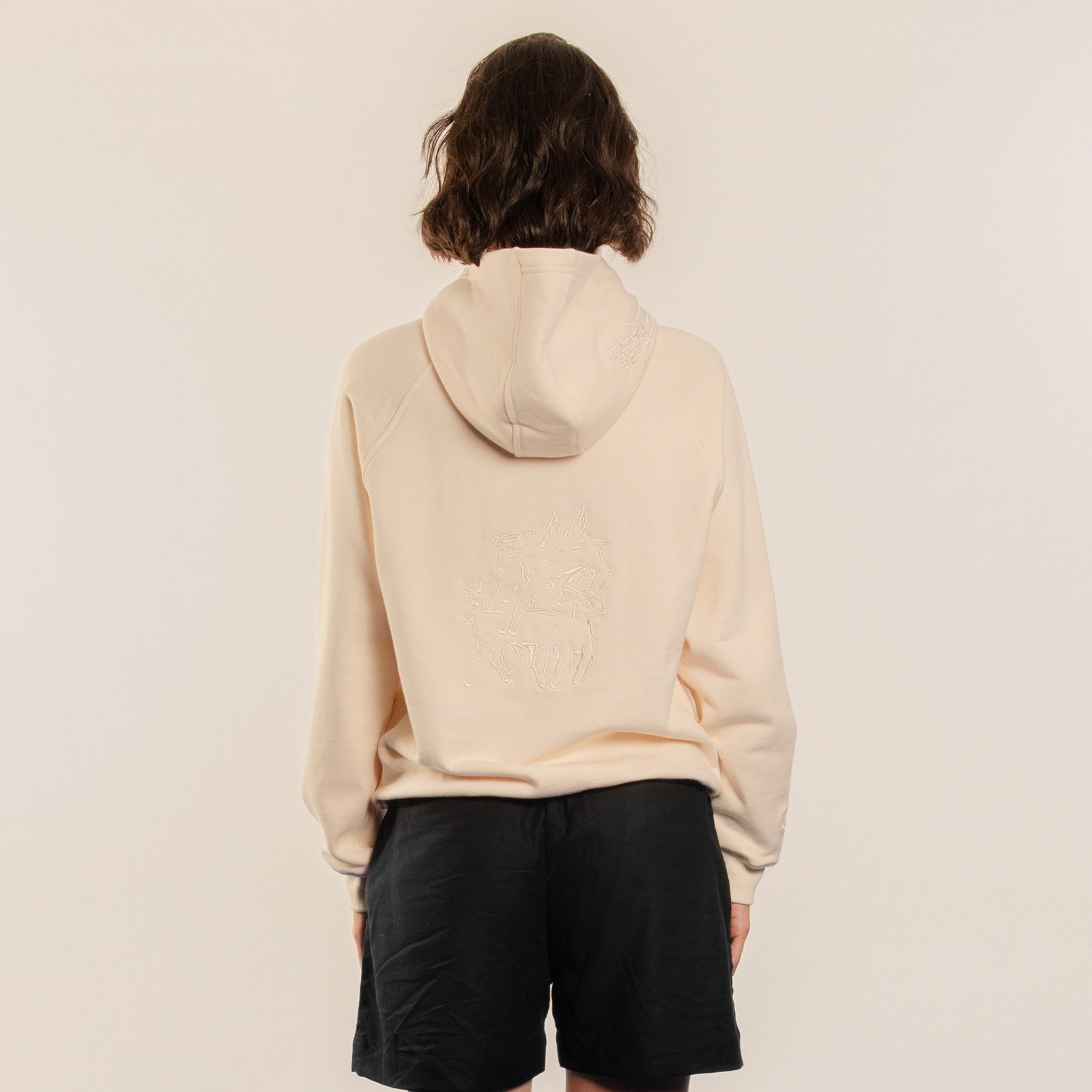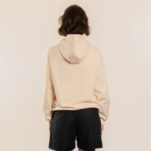 Hoodie cerrado marfil relaxed fit con bolsillo tipo canguro. Bordado tono a tono de ilustración “Cordero, Cordero, Cordero” en espalda.