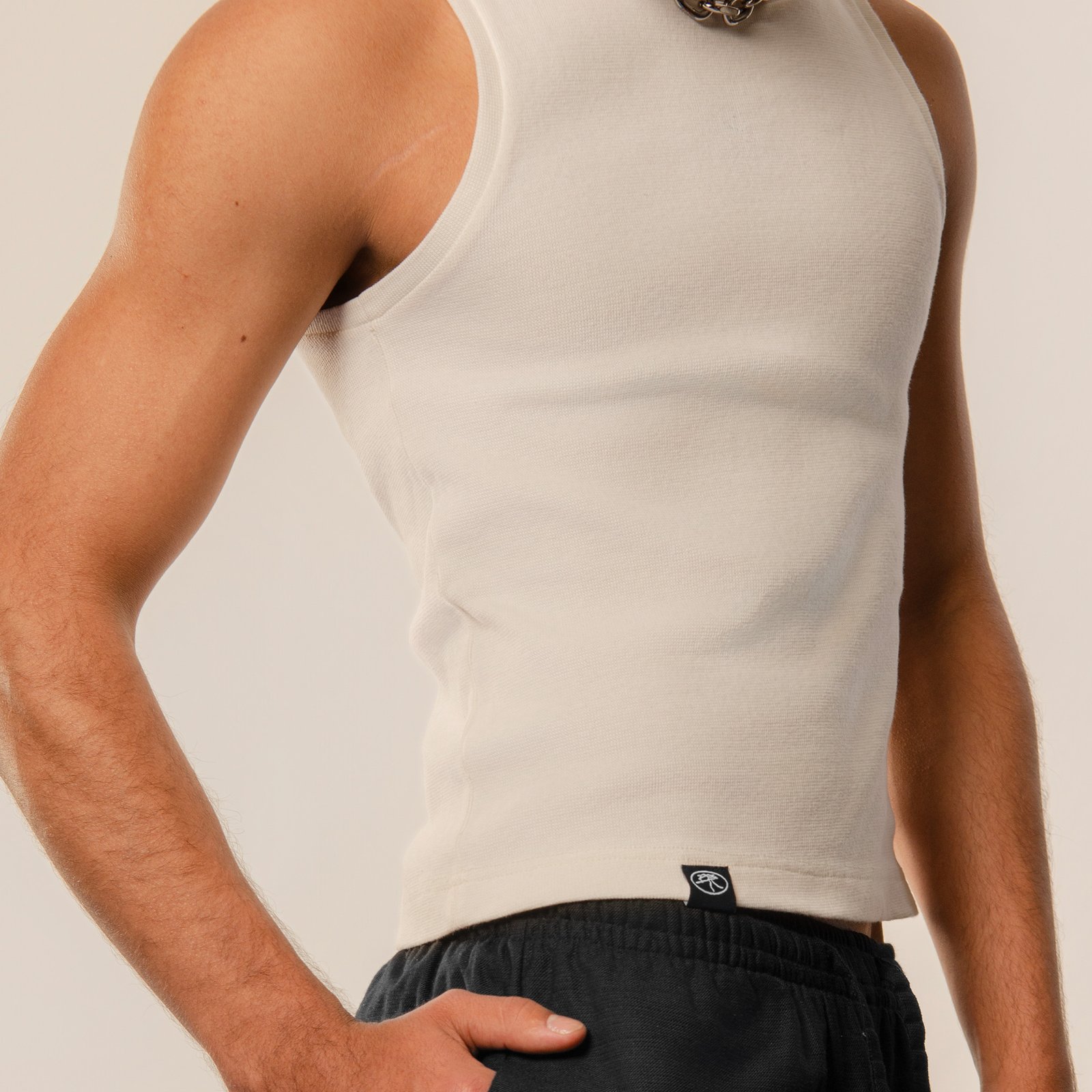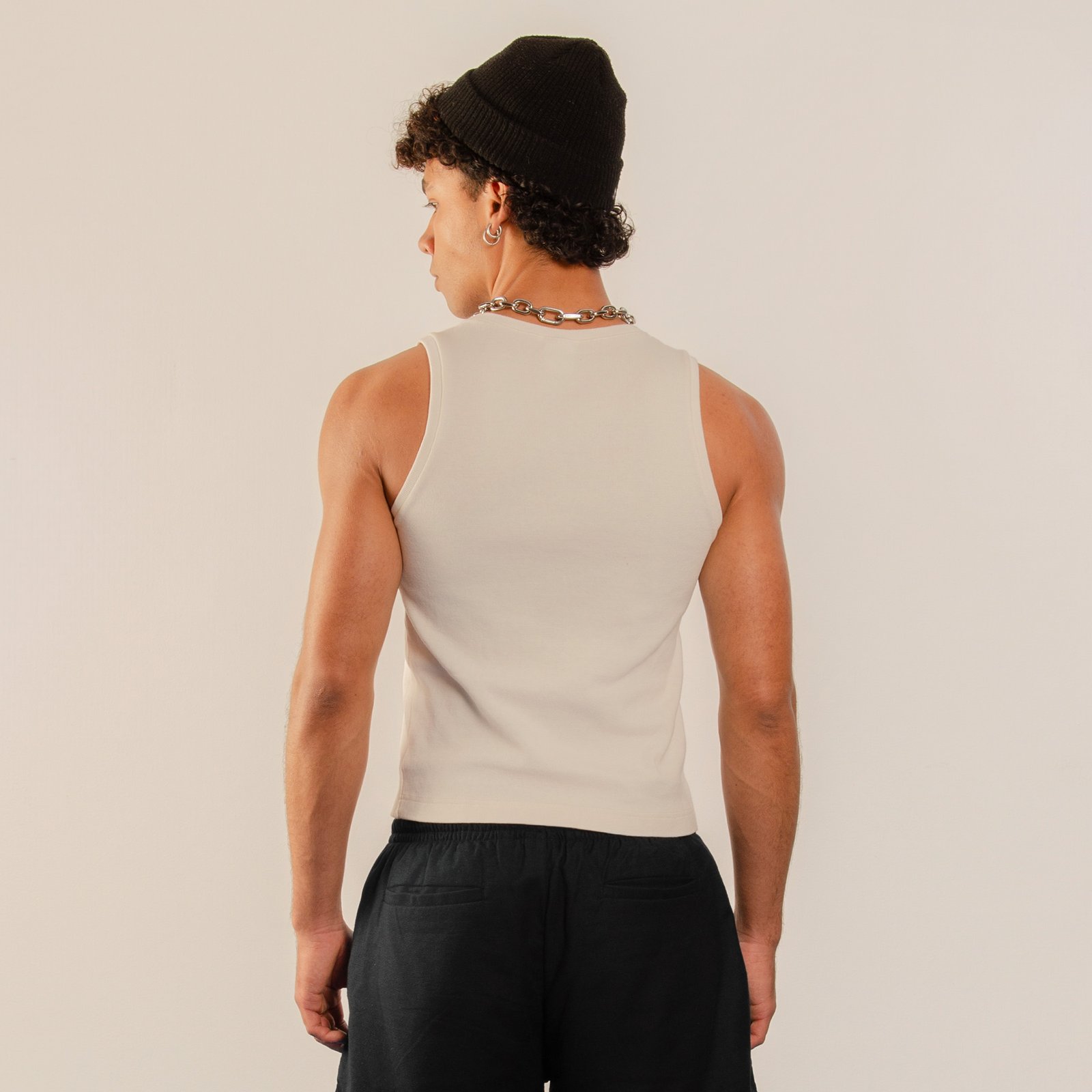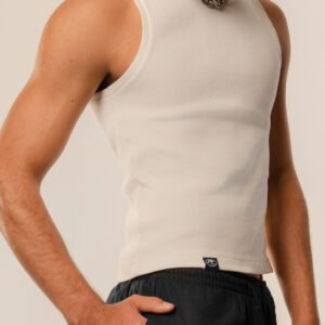 Tank top en 100% algodón rib pesado. Cuello redondo alto en espalda y semi-profundo en frente.